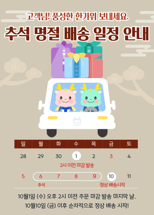 추석 명절 후 정상 배송은 10월10일(금) 택배 발송, 다음날 도착 배송 됩니다.
